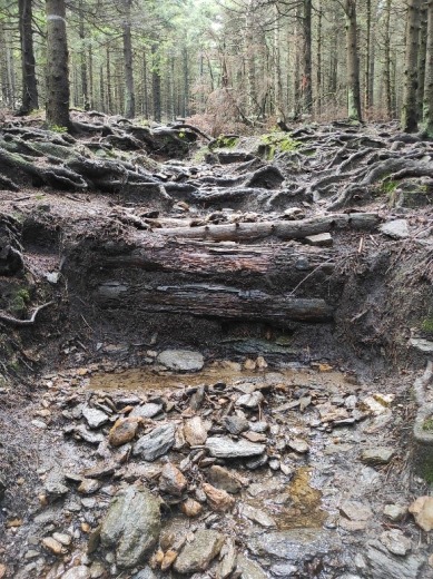 Při silných deštích je půda ze stezky splavována až k Obřím skalám, foto Vít Slezák.