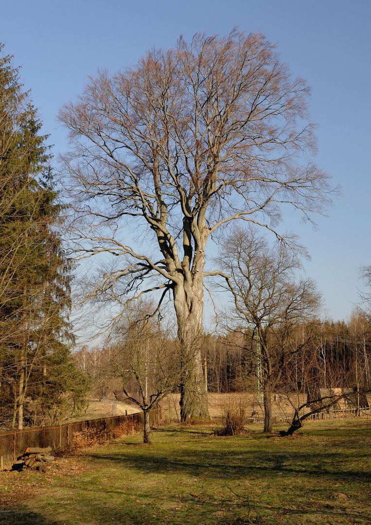 Největší buk Jizerských hor se svalovitě stočeným kmenem, u hájovny Na hrázi za Šolcovým rybníkem.