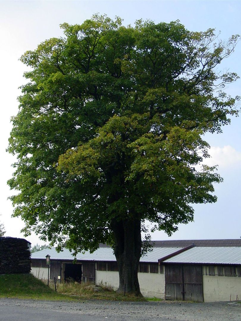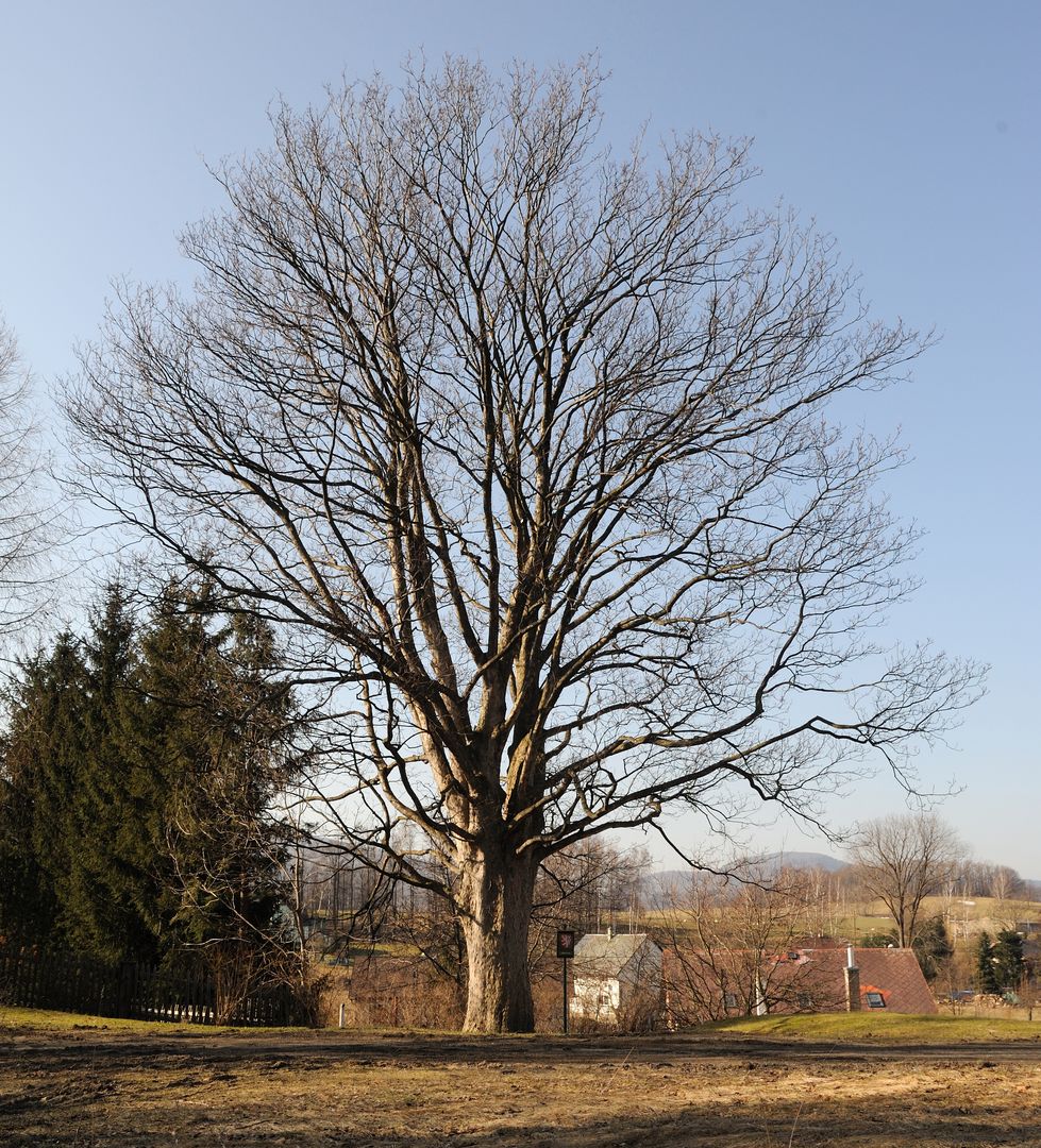 Mohutný jedinec se svalovitě stočeným kmenem, u č.p. 12 v horní část obce