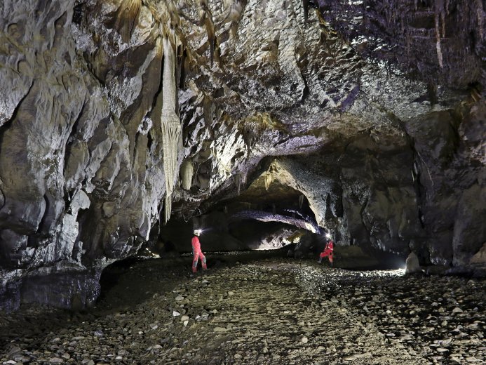 K podzemním krasovým jevům jsou řazeny jeskyně s výplněmi. Jeskyně vznikaly v několika fázích krasové modelace – dokládají to především výškové úrovně jeskynních vchodů. Na tvorbě jeskyní se podílí geologická stavba území za spoluúčasti koroze (rozpouštění) a eroze vápenců, místy se projevuje i řícení.