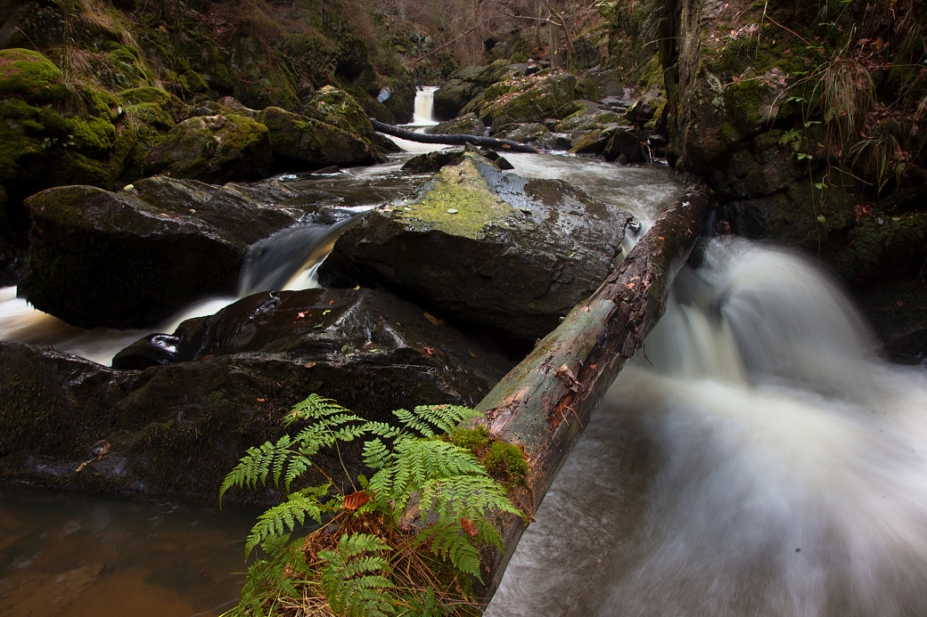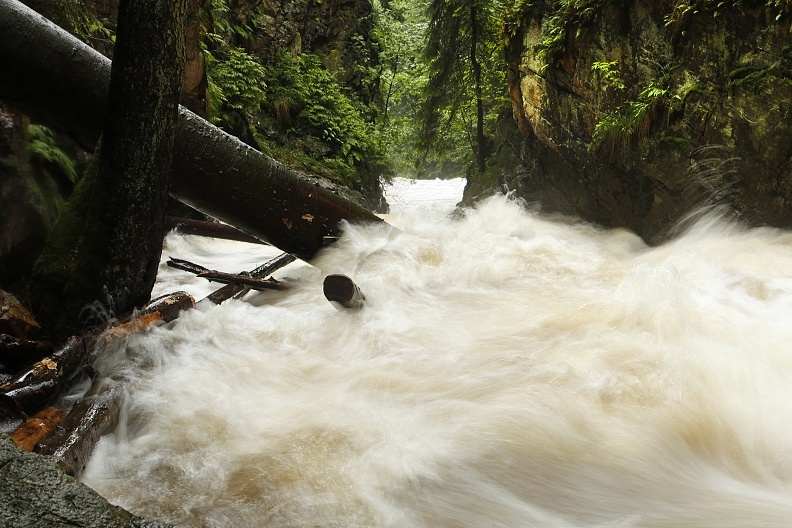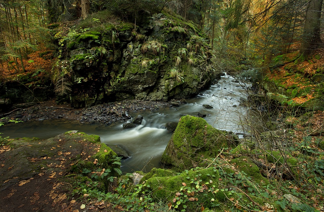 Divoký tok řeky Doubravy pod vodopádem v přírodní rezervaci Údolí Doubravy