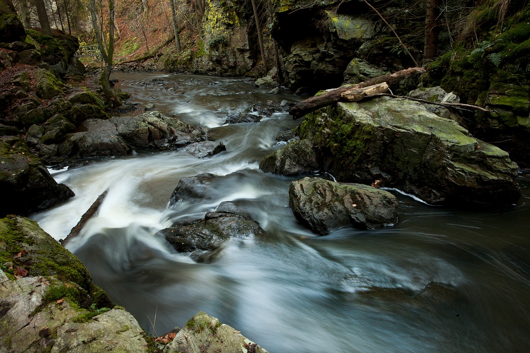Kamenitá část tok Chrudimky v přírodní rezervaci Srádovské Peklo.