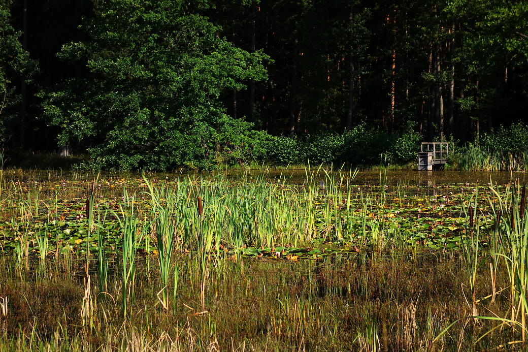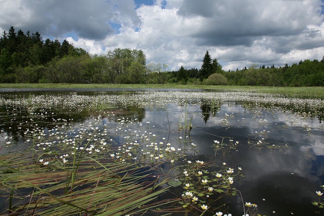 Hladina rybníka Hubský je začátkem léta pokrytá porostem lakušníků.